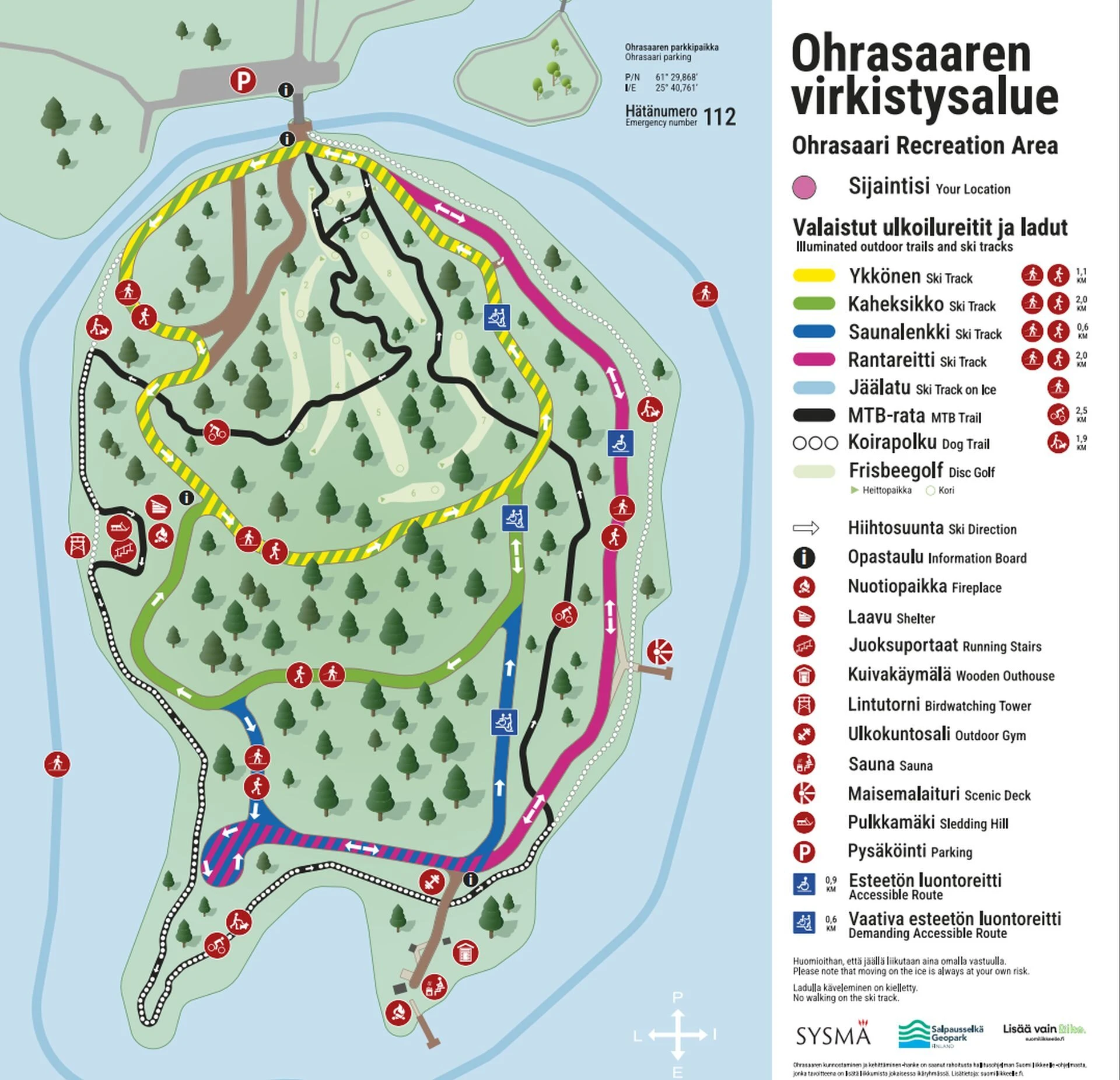 In Ohrasaari there are plenty of functions for all kinds of exercise: a 9-basket frisbee golf course, lighted ski tracks, an outdoor gym, a mountain biking route, an orienteering course as well as running stairs in connection with the bird tower. From Ohrasaari can be found an accessible as well as a demanding accessible nature trail. In addition, at the southern end of the island there is a sauna owned by the municipality and a campfire place, in the yard area there is also a toilet for hikers’ use. On the island there is a bird tower and a lighted sledding hill.